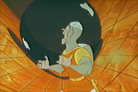 Si le jeu est si accrocheur donc, et j'insiste sur ce point, c'est grâce à la difficulté plutôt maitrisée de façon générale (sauf le début... Le coup du pont c'était peut être un peu exagéré pour des débutants, fallait commencer plus soft quoi...) que l'on s'amuse réellement à Dragon's Lair, que l'on a envie de continuer. Elle est parfois frustrante oui, mais elle fait progresser le joueur petit à petit, morceau par morceau et cela assez rapidement pour empêcher au maximum que l'ennui s'installe.
