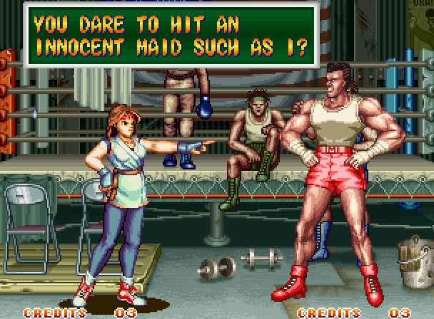 Art of Fighting c'est un jeu de man, on découvre les soutient gorge à grand coup de poing dans la gueule! Nan mais!