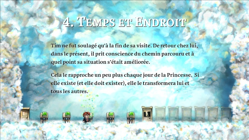 Ce n'est pas la seule fois que le jeu pourrait faire penser à Mario puisqu'un grand nombre de référence y sont glissé des ennemis jusqu'au scénario même puisque Tim se doit d'aller sauver la Princesse. Quelle Princesse? Où? Quand? Comment? Ce n'est pas clair et des livres sont présent au début de chaque monde pour raconter des étapes de la vie de Tim qui a l'air sans rapport avec le jeu. Ce dernier est par ailleurs extrêmement métaphorique et il est loin d'être évident de comprendre tout le scénario même si la fin de Braid possède une révélation tout ce qu'il y'a de plus marquante!