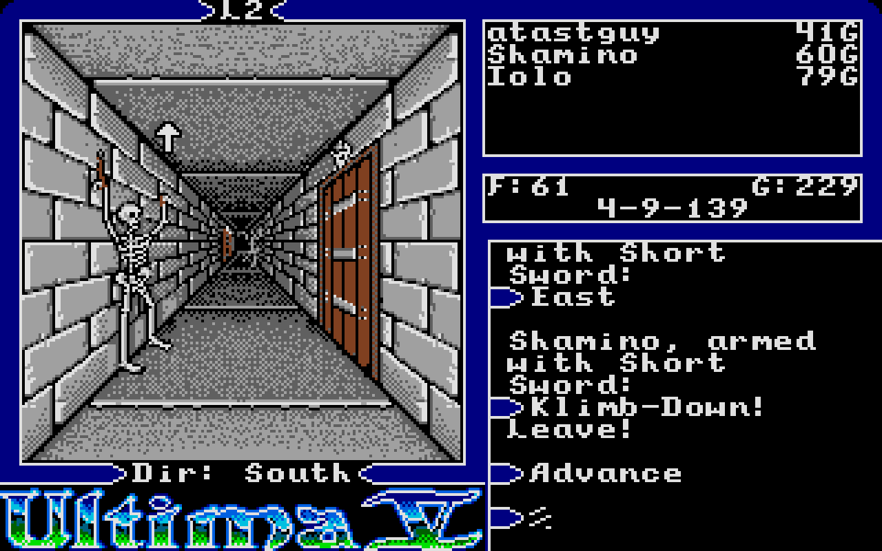 Qui que ce soit, il semblerait qu’enfin, pour ce cinquième et dernier portage, le développeur ait décidé de revoir l’équilibre du jeu qui pouvait être un défaut de l’original. Ici au contraire j’ai eu l’impression de toucher bien plus facilement les différents ennemis que sur Apple II ! Par contre j’ai aussi eu l’impression qu’il avait un plus grand nombre d’ennemi sur la map sans que ce soit exagéré… Enfin, tout comme Ultima IV, on commence le jeu avec davantage de reagent voir même des sorts et ça c’est plutôt agréable ! Pour être honnête je suis même étonné que les donjons respectent la charte graphique des autres épisodes avec une authentique grotte là où il est censé y avoir une grotte ! Rappelons tout de même qu’Ultima IV (certes 3 ans avant ) avaient des murs ultras basiques tout bleu et qu’Utlima Trilogy partageait les mêmes murs de grotte de pixels unique à cette version.. Mais là c’est bien plus propre ! L’OST semble aussi relativement fidèlement retranscrit, elle est pas accélérée comme Ultima IV ou unique ( et moins bonne ) comme le III mais j’en suis pas fan pour autant, certains sons semblent un peu exagérés comme Britannic Lands au bout de 30 secondes ou tout simplement le “zgling” de Greyson’s Tale... C’est d’autant plus dommage que d’autres musiques comme celle de l’underworld Worlds Below sonne au contraire plutôt bien et que les petits changements harmoniques de Lord Blackthorn prouve qu’une certaine attention a été accordée aux remixs… Même si elle pour le coup je la trouve un peu nasillarde...