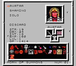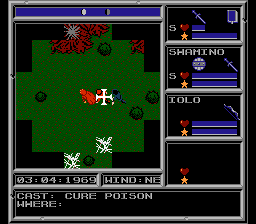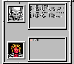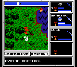 Par contre, il faut reconnaître que ça fait étrange de voir tout le contenu du jeu reporté dans un mode de visualisation qui n'est pas le sien. Y'a un petit côté fascinant, comme une sorte de proto raté du futur Ultima VI... Il le paye cher d'ailleurs puisque moi, déjà, sur émulateur, je pige pas toujours ce que je vois à l'écran mais alors essayez d'imaginer avec le flou d'une télé cathodique, ce doit être affreux ! Le jeu souffre vraiment de son ambition avec des villes qui sont dans le même espace que les routes de l'overworld sans qu'on ait l'impression d'être un géant avant de marcher sur la case "ville" et entrer dedans... Bref, tout comme un W-RPG moderne ! Du coup, comme Ultima VI, le jeu devient beaucoup plus brouillon avec une caméra bien trop rapprochée pour pouvoir avoir une action aussi lisible qu'avant... Alors forcément vous vous imaginez que ce type de vue déjà ambitieux sur DOS devient carrément inapproprié sur NES ! Les développeurs ont essayé très fort de placer le plus d'éléments possibles du jeu original sur une carte que la malheureuse NES essaye tant bien que mal d'afficher mais hélas, il y a eu beaucoup de contenu coupé. Des bâtiments, des magies, l'intro et plus étonnant.. Beaucoup de dialogues.