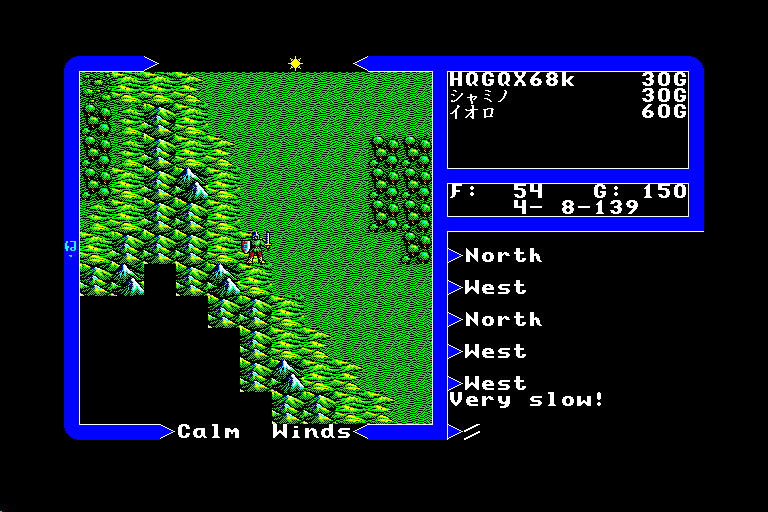 Bien sûr, il n’y a aucune raison qu’Ultima V ne sorte pas sur les micro-ordinateurs Japonais ce qui se fit en 1990 sur PC-98 et Sharp X68000. Souvenons-nous alors que Pony Canyon ont d’abord commencé à produire Ultima IV puis la trilogie Ultima I, II et III et les voici juste à l’heure pour le V ! Et on les reconnaît bien à leurs graphismes tout refaits mais décidément similaires à leurs autres portages. Pour leur défense, cette version PC-98 est sans doute la plus jolie qu’ils aient produite… Après, si ces grandes cases d’herbe toute verte pouvaient encore bien fonctionner dans Ultima IV étant donné qu’on était dans une période de paix, elle détonne bien davantage durant l’âge sombre de Blackthorn… Il aurait sans doute fallu les colorier en marron ou quelque chose comme ça… Et je ne parle même pas de la nuit où on se retrouve avec des cases d’herbes toute vertes… Mais avec un cône de vision ! Et je ne parle même pas de l’underworld bêtement identique à la surface ! Dans le fond, c'est le même souci que ce que je reprochais déjà à Ultima II il y a un moment… Avec son monde soi-disant post guerre nucléaire qui, pourtant, a les mêmes herbes vertes que les autres ! Et décidément, j’ai toujours l’impression que ces versions n’étaient pas vraiment fait avec amour ce qui est étonnant vu comme Richard Garriott lui-même est allé démarcher les compagnies Japonaises et que je soupçonne toujours un peu Pony Canyon et Fujitsu de ne faire qu’un en secret sans en avoir vraiment la preuve.