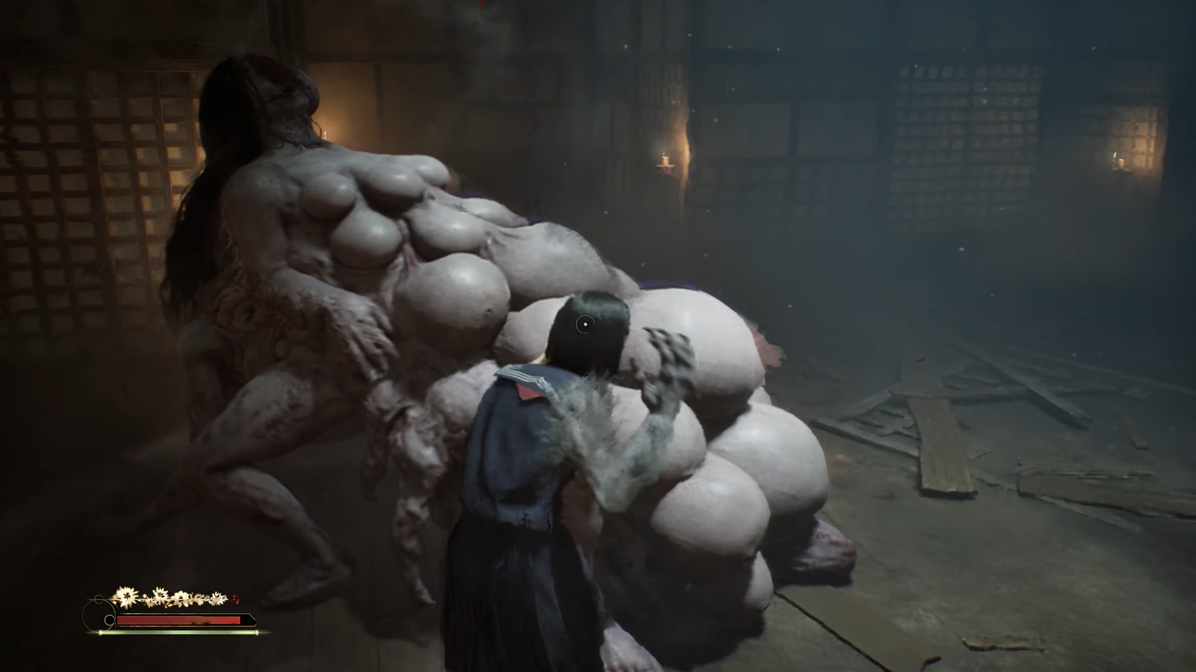 Il est difficile de nier un certain amateurisme notamment dans le manque d’intérêt de la jauge de santé mentale par rapport au reste… N’est pas From Software qui peut dans la création de systèmes ludiques. Mais je ne peux pas vraiment leur en tenir rigueur, car on sent le désir de bien faire par des petites choses comme le fait que courir en dehors des combats ne gâchent aucune endurance et à l'inverse l'envie que cette jauge te limite vraiment durant les affrontements ! Comparé aux précédents Silent Hill où on avait toujours un peu l’impression que les personnages ( surtout masculins ) avaient un certain détachement, un certain flegme par rapport à l’horreur qu’ils traversent, ça me plait pas mal d'avoir des combats un peu plus profond et tendus. Car Hinako n'est pas étrangère à l’action du jeu, ces affrontements l'épuisent, elle fait régulièrement des commentaires effrayés ou au contraire étonnamment apathique et le scénario saura nous montrer comme ces épreuves marqueront directement sa chair.