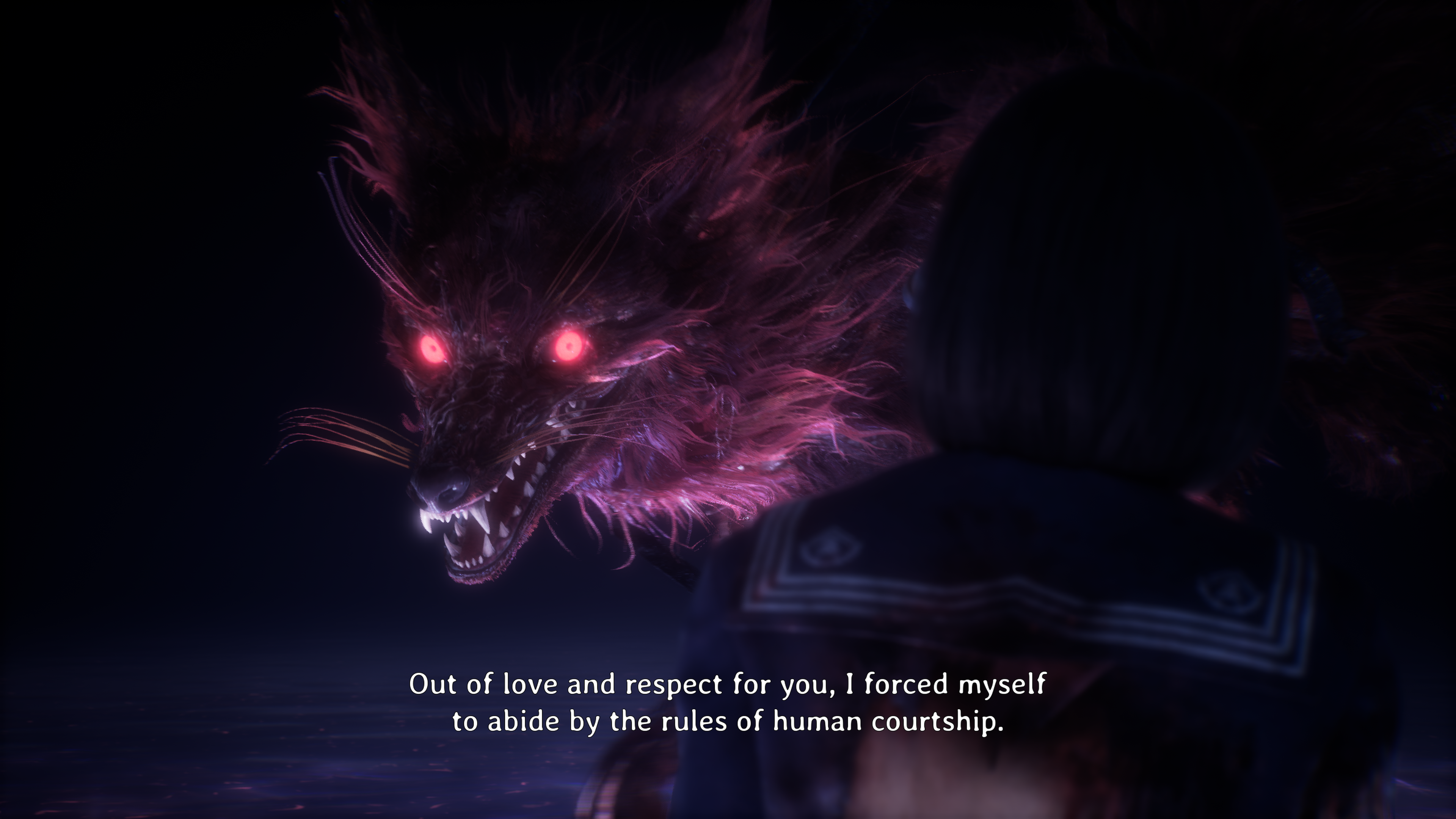 Pour autant, malgré ces coupures dans l’ambiance du jeu, cette difficulté m’a permis de constituer une véritable empathie envers cette Hinako. Elle vit un véritable cauchemar et moi je le vis avec elle en essayant d’affronter des versions cauchemardesques de ses peurs ce qui nous permet de partager ensemble ses griefs. Ainsi le gameplay et le propos du jeu deviennent cohérents l’un avec l’autre ce qui est toujours chouette à rechercher. La difficulté me permet aussi d’avoir moins de scrupule à fuir les différents ennemis pour aller vers mon objectif… Alors que de l’autre côté, des amis ayant fait le jeu en mode de difficulté « Story » ont bien moins eu ce sentiment et ont même régulièrement trouvé que le jeu était beaucoup trop remplis de combat à leur goût.