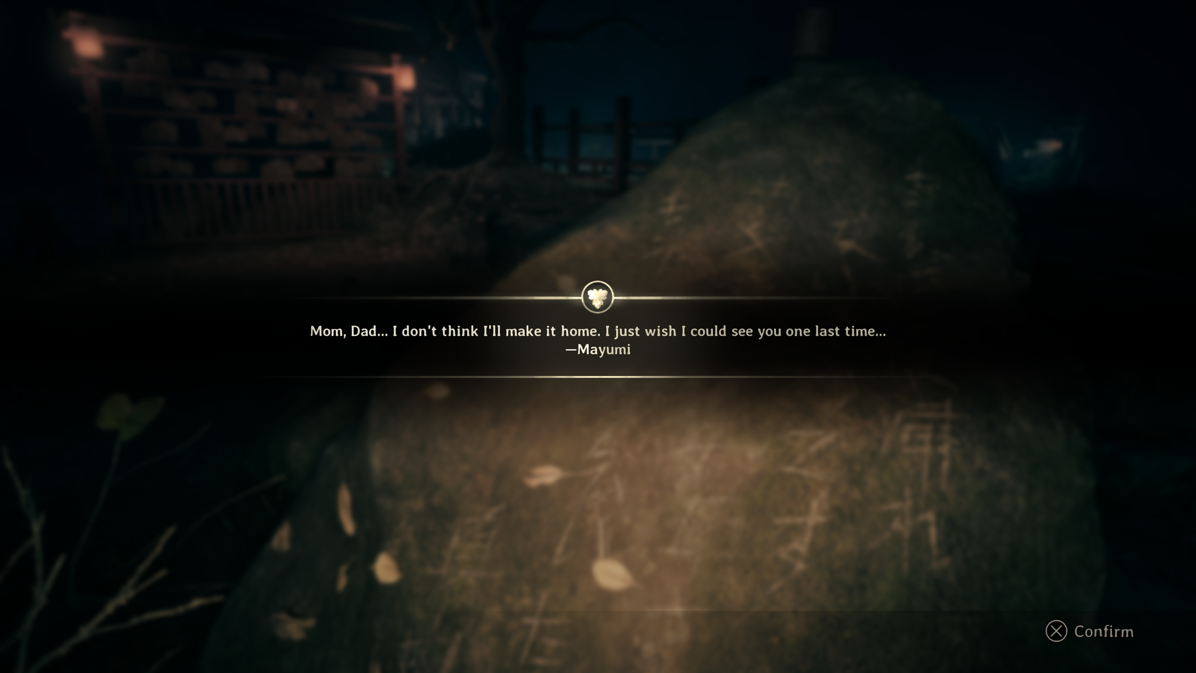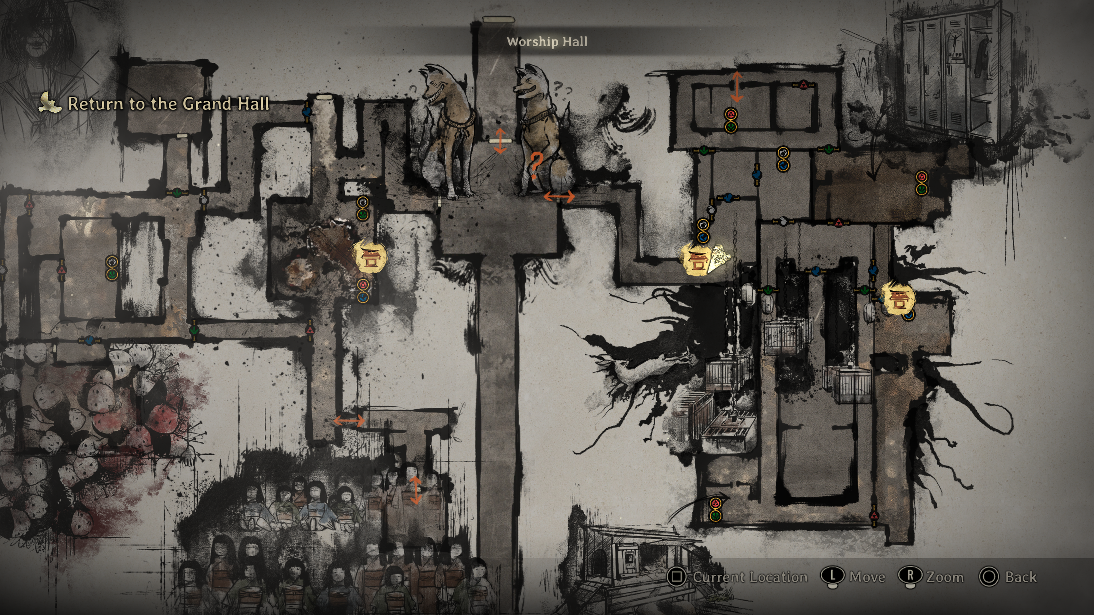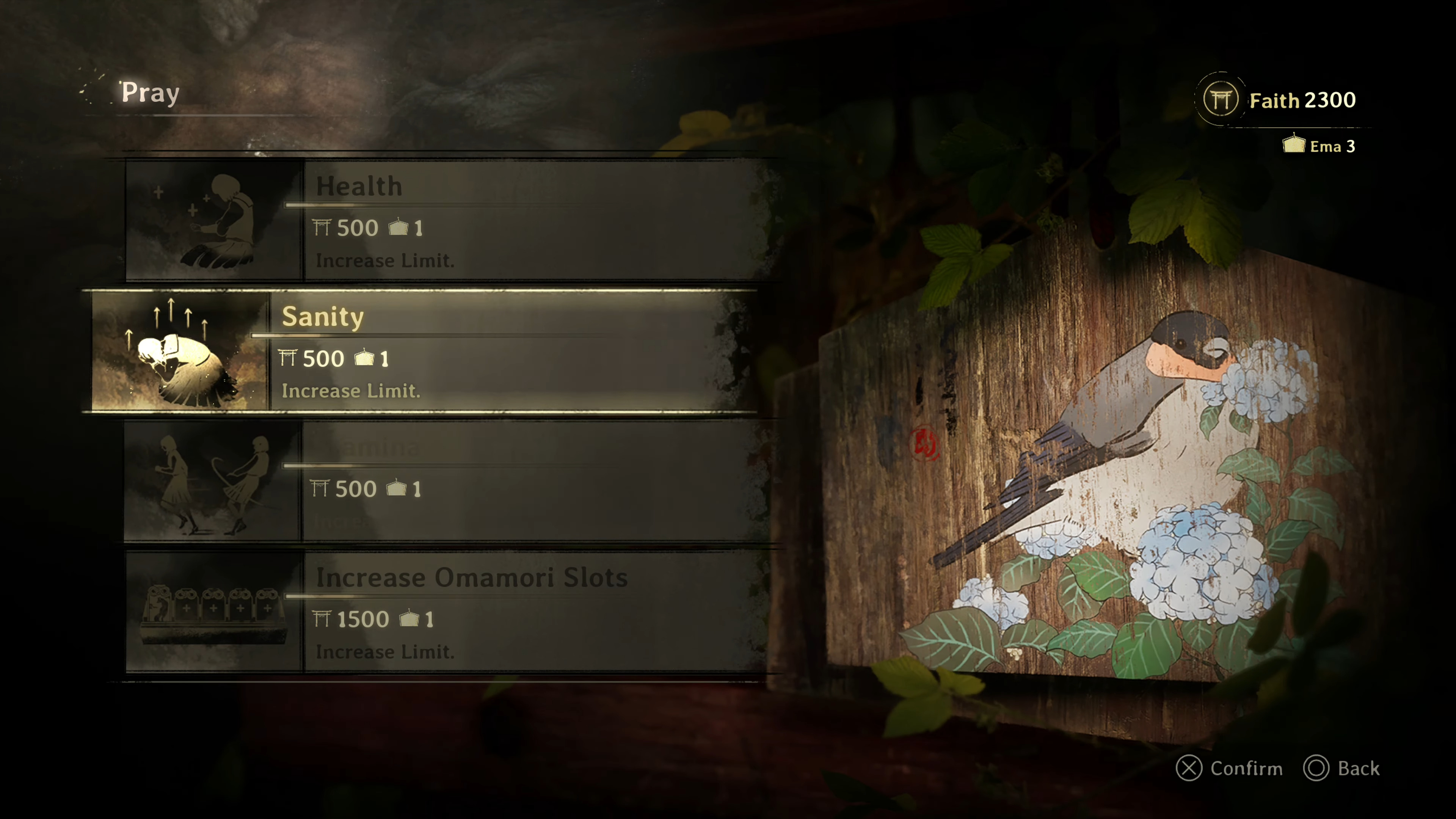 Bien sûr, survival-horror oblige, il y aura tout un tas de ressource à récupérer pour survivre dans ce monde. Des objets de soins bien sûr notamment ces petites pilules rouges donnés par Shu et permettant de monter facilement la jauge de santé mentale. Beaucoup de ces ressources cependant ont la possibilité être offert « aux dieux » via les lieux de sauvegarde pour obtenir des points. Ces derniers couplés avec une plaque de vœu peuvent permettre d’augmenter les capacités de l’héroine de plusieurs manières, soit avec plus de vie, soit avec plus de sanité, soit avec plus d’endurance voir plus de slot d’accessoires….