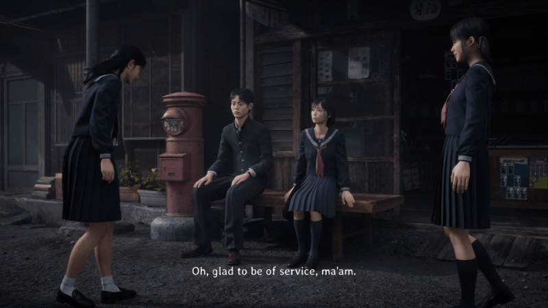 Des rues étonnamment vides pour Hinako qui s’en était allé rejoindre ses amis Satsuko, Rinko et Chu dans un magasin local… Mais tout ce petit début à quelque chose d’irréel, de tranquille, on peut se ballader dans les montagnes et l’entrée du village sans que l’action ne commence vraiment mais avec une certaine liberté quand même dans un univers de jeu assez bien modélisé et Hinako faisant quelques commentaires ici et là.